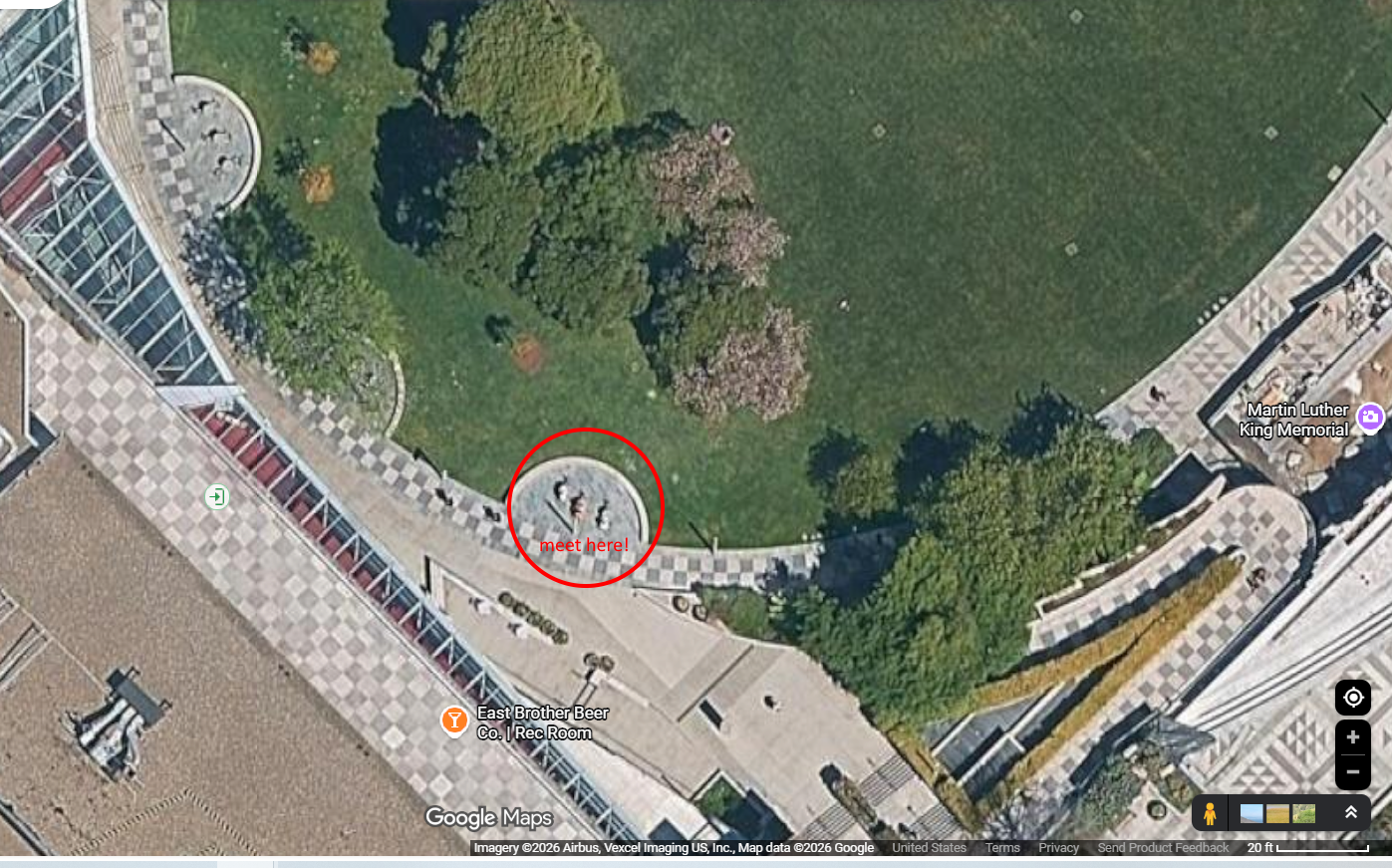 Meeting at Yerba Buena Gardens, just outside the Metreon east side entrance, at the southernmost semicircular stone sitting area - see picture below. In case of weather, we will move to inside the Metreon, exact tables TBD - keep an eye out on our Discord!